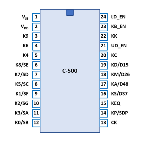 The C-500 uses a keyboard scanning matrix with all of its 18 keys connected directly to a corresponding pin, while the common signal is connected to a dedicated Keyboard Enable pin. Six of the 18 keys are using dedicated Key Input pins, four are shared with the Digit Outputs and eight are shared with the Segment Outputs. To allow for the use of the Digit and Segment Output pins as Key Input pins, the C-500 is blanking the display completely before each Display Scanning Cycle while reading the keyboard.