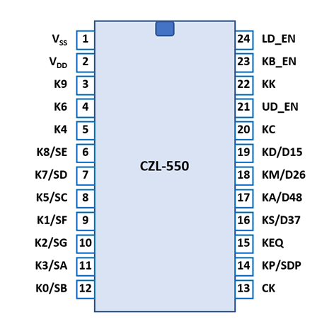 The CZL-550 uses a keyboard scanning matrix with all of its 18 keys connected directly to a corresponding pin, while the common signal is connected to a dedicated Keyboard Enable pin. Six of the 18 keys are using dedicated Key Input pins, four are shared with the Digit Outputs and eight are shared with the Segment Outputs. To allow for the use of the Digit and Segment Output pins as Key Input pins, the CZL-500 is blanking the display completely before each Display Scanning Cycle while reading the keyboard.