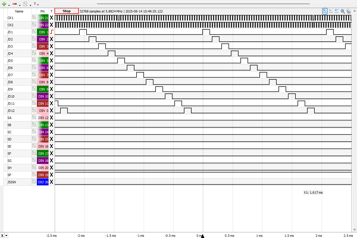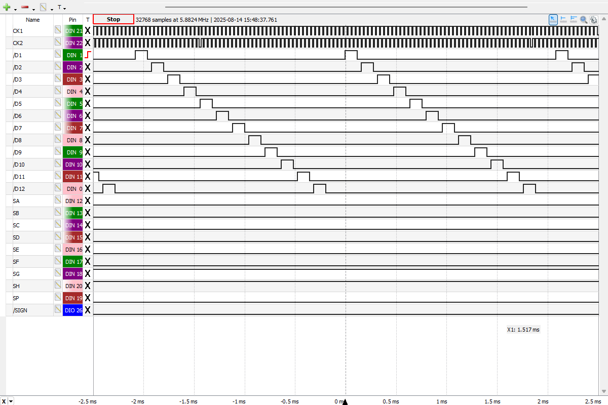 Testing captured with the Digilent Digital Discovery connected to the DCM-50A Platform. MK5011 Clock Frequency at 25 kHz. ![]() |