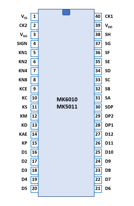 Pin IO Function Pin IO Function 1 V Common Voltage VSS 40 I Digit driver 9 (MSD) 2 I Clock Phase 2 39 V Negative Voltage VDD 3 V Negative Voltage VGG 38 O Segment driver H 4 O Sign driver 37 O Segment driver G 5 I Encoded Key input '1' 36 O Segment driver F 6 I Encoded Key input '2' 35 O Segment driver E 7 I Encoded Key input '4' 34 O Segment driver D 8 I Encoded Key input '8' 33 O Segment driver C 9 I Key input [CE] 32 O Segment driver B 10 I Key input [C] 31 O Segment driver A 11 I Key input [−=] 30 O Segment driver DP 12 I Key input [x] 29 I Decimal Point Sel.2 13 I Key input [:] 28 I Decimal Point Sel.1 14 I Key input [+=] 27 O Digit driver 12 (MSD) 15 I Key input [.] 26 O Digit driver 11 16 O Digit driver 1 (LSD) 25 O Digit driver 10 17 O Digit driver 2 24 O Digit driver 9 18 O Digit driver 3 23 O Digit driver 8 19 O Digit driver 4 22 O Digit driver 7 20 O Digit driver 5 21 O Digit driver 6
