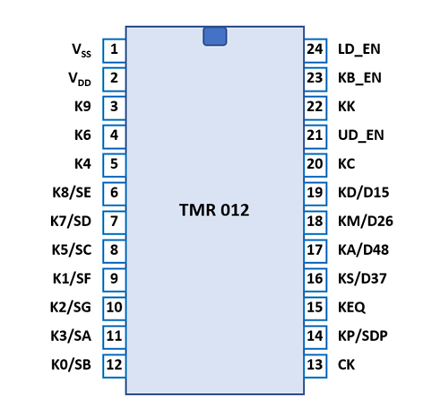 The TMR 012 uses a keyboard scanning matrix with all of its 18 keys connected directly to a corresponding pin, while the common signal is connected to a dedicated Keyboard Enable pin. Six of the 18 keys are using dedicated Key Input pins, four are shared with the Digit Outputs and eight are shared with the Segment Outputs. To allow for the use of the Digit and Segment Output pins as Key Input pins, the TMR 012 is blanking the display completely before each Display Scanning Cycle while reading the keyboard.