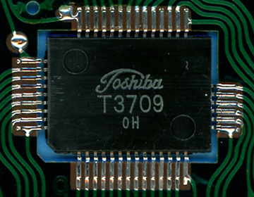 Close-up view of the Toshiba T3709 single-chip calculator circuit.
