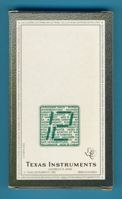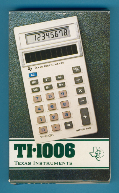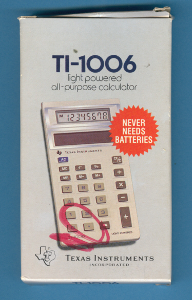 of the TI-1006 sold in Europe around 1982. This box of this TI-1006 states "BATTERY FREE" instead of the later "LIGHT POWERED" description.