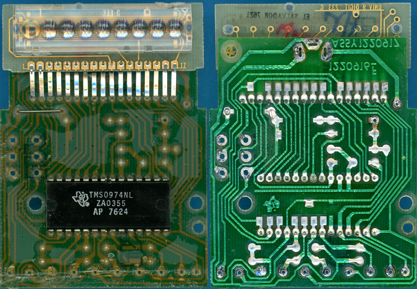 (PCB) of a TI-1270 calculator with its (mirrored) backside.