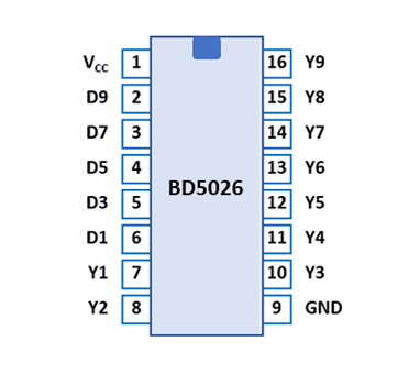 The BD5026 uses a standard 0.3 wide 16-pin DIP (Dual In-line Package with a 0.1 / 2.54 mm lead pitch).