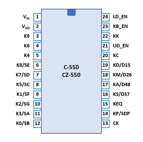 The C-550 and CZ-550 are using a keyboard scanning matrix with all of its 18 keys connected directly to a corresponding pin, while the common signal is connected to a dedicated Keyboard Enable pin. Six of the 18 keys are using dedicated Key Input pins, four are shared with the Digit Outputs and eight are shared with the Segment Outputs. To allow for the use of the Digit and Segment Output pins as Key Input pins, the C-550 and CZ-550 are blanking the display completely before each Display Scanning Cycle while reading the keyboard.