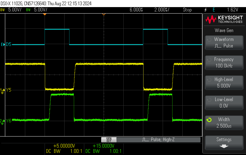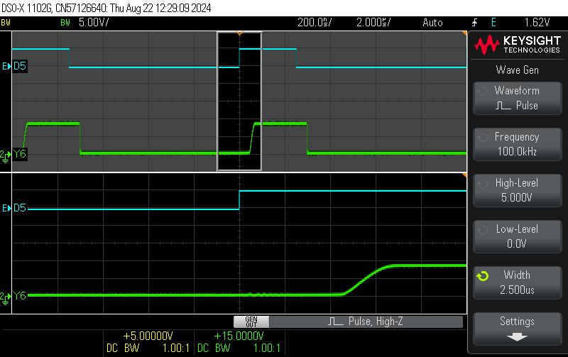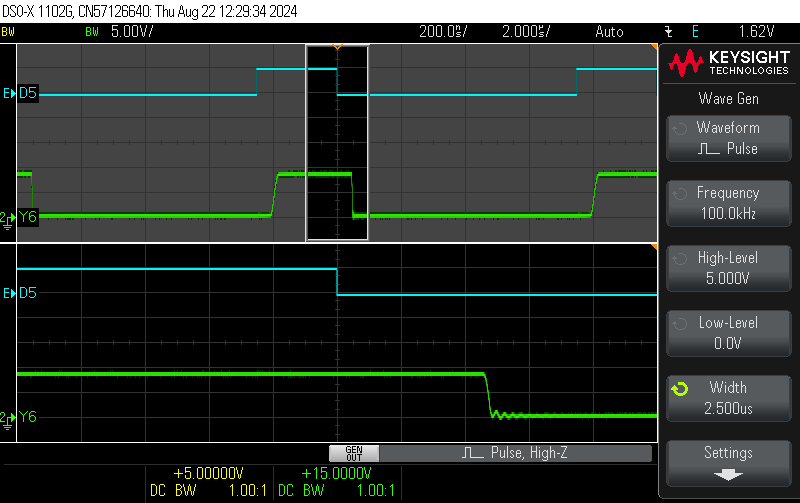 and its direct output Y5. DUT: BD5026 7542 @ VCC = 9 V, TPULSE = 0.5 ms, RLOAD = 220 Ohm / ILOAD = 40 mA. ![]() |