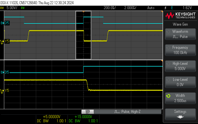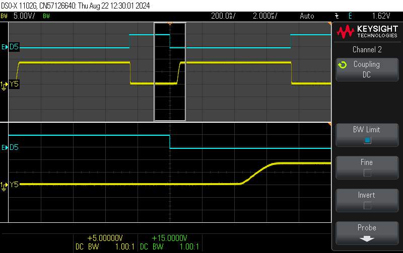 of the Off Delay between BD5026 input D5 and its direct output Y5. DUT: BD5026 7542 @ VCC = 9 V, TPULSE = 0.5 ms, RLOAD = 220 Ohm / ILOAD = 40 mA. ![]() |