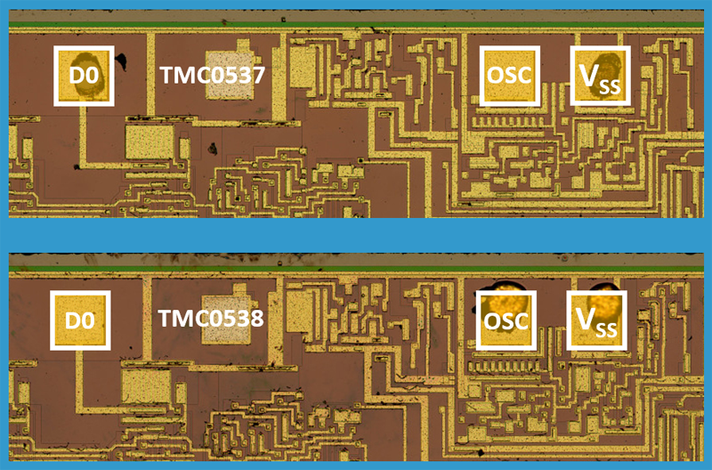 view of the bond-out options for the clock oscillator of the TMC0530 SCOM (Scanning and Read-Only Memory) Chip. Die Photos of the TMC0530B/TMC0537 (top) and TMC0530B/0538 (bottom) courtesy of Sean Riddle. |