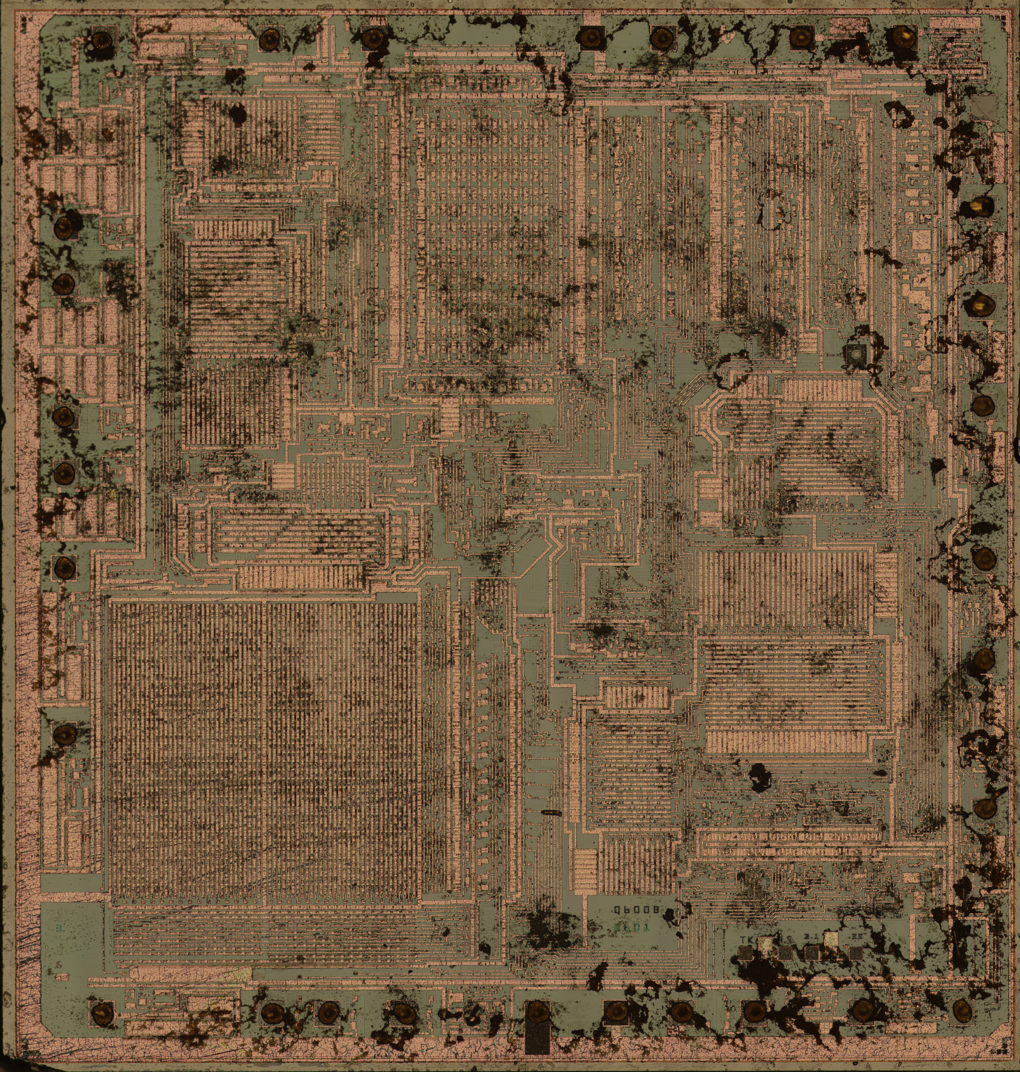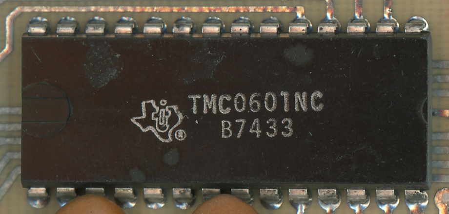 of the TMC0601 single-chip calculator circuit used with the TI-2550. PMOS Technology, 28-pin DIP 4-bit serial Register Processor, 384*11 Bits Instruction ROM, 3*13*4 Bits Data SAM. ![]() |