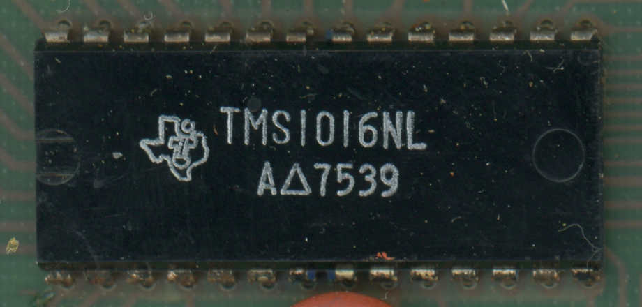 view of the TMS1016 single-chip calculator circuit used with the SR-16 II. PMOS Technology, 28-pin DIP 4-bit Microcontroller, 1,024*8 Bits Instruction ROM, 64*4 Bits Data RAM. ![]() |