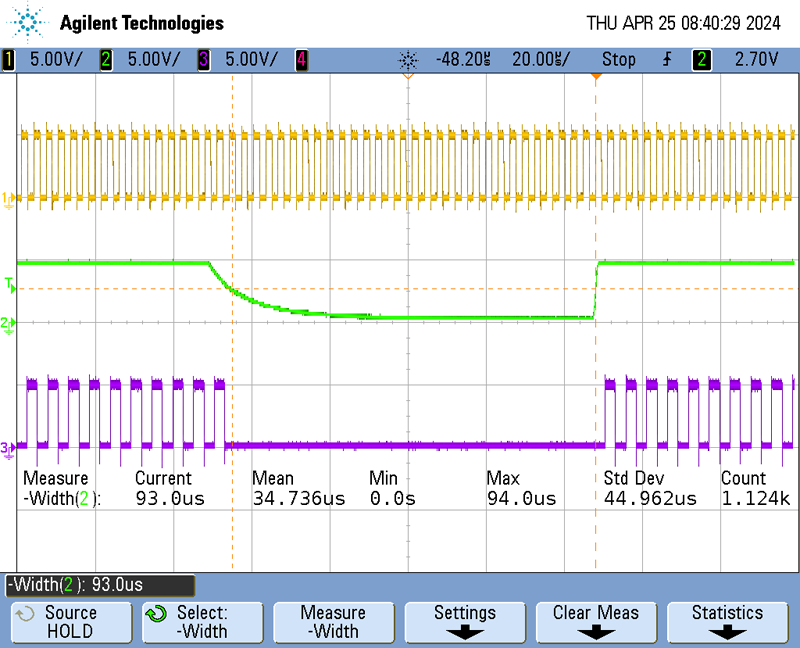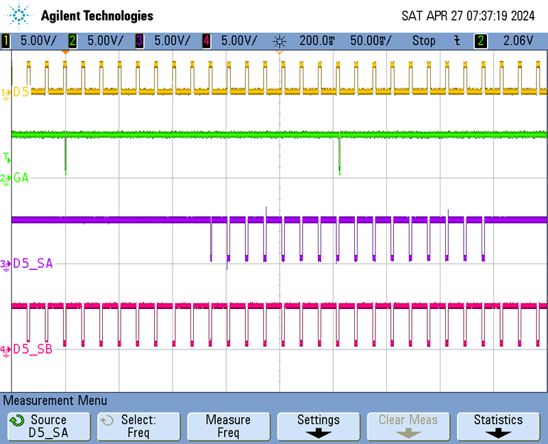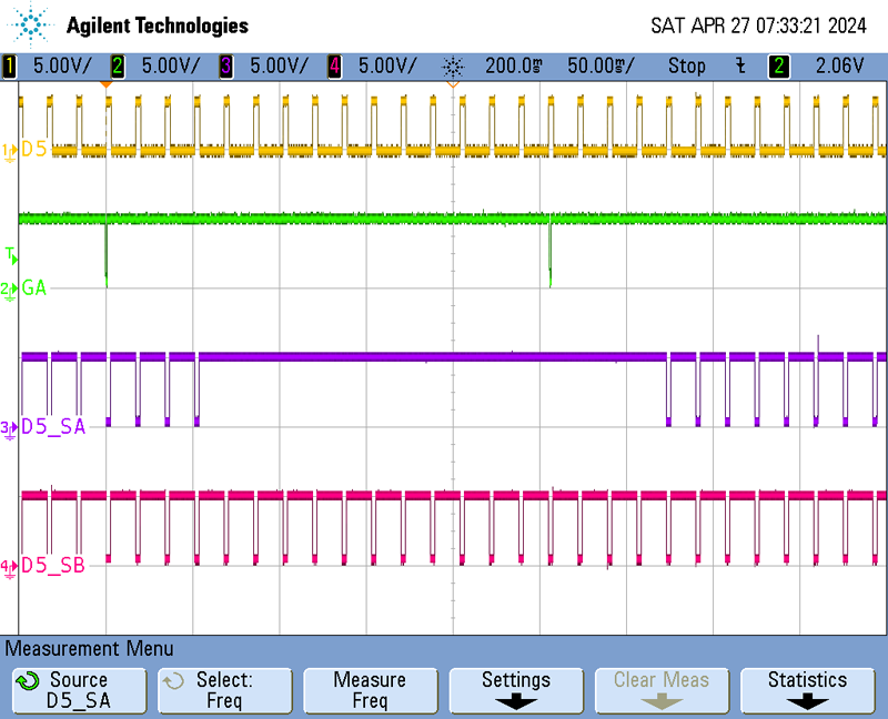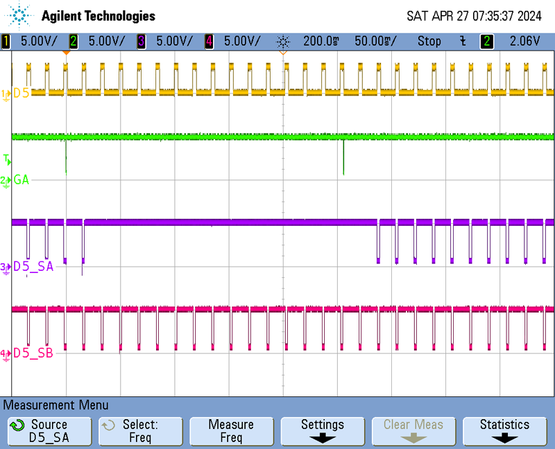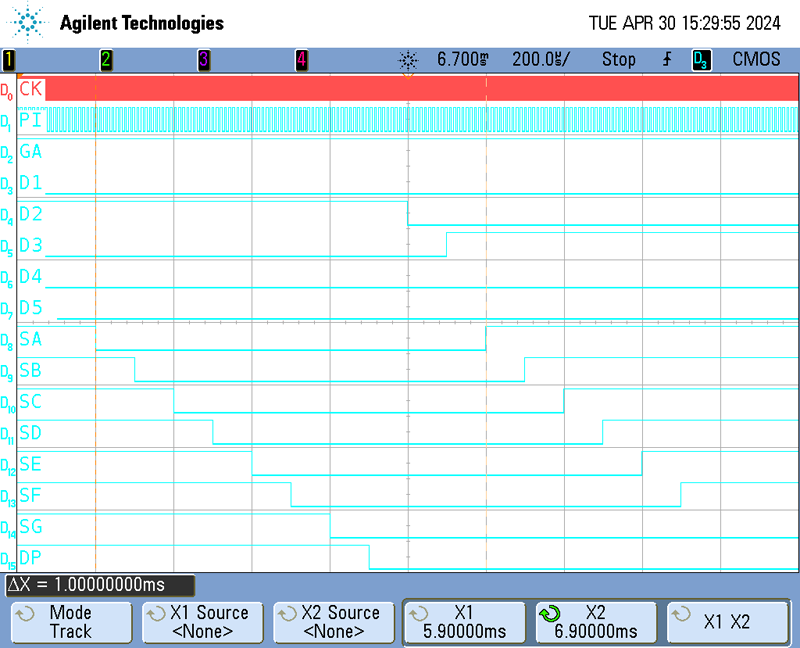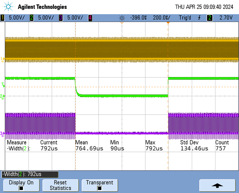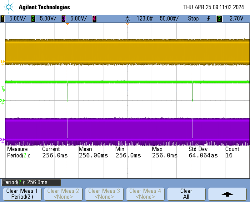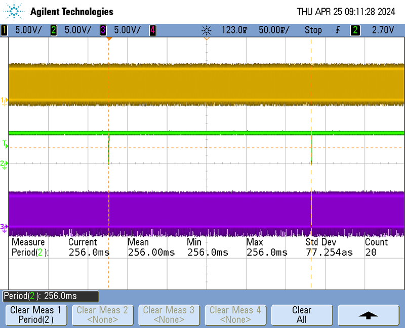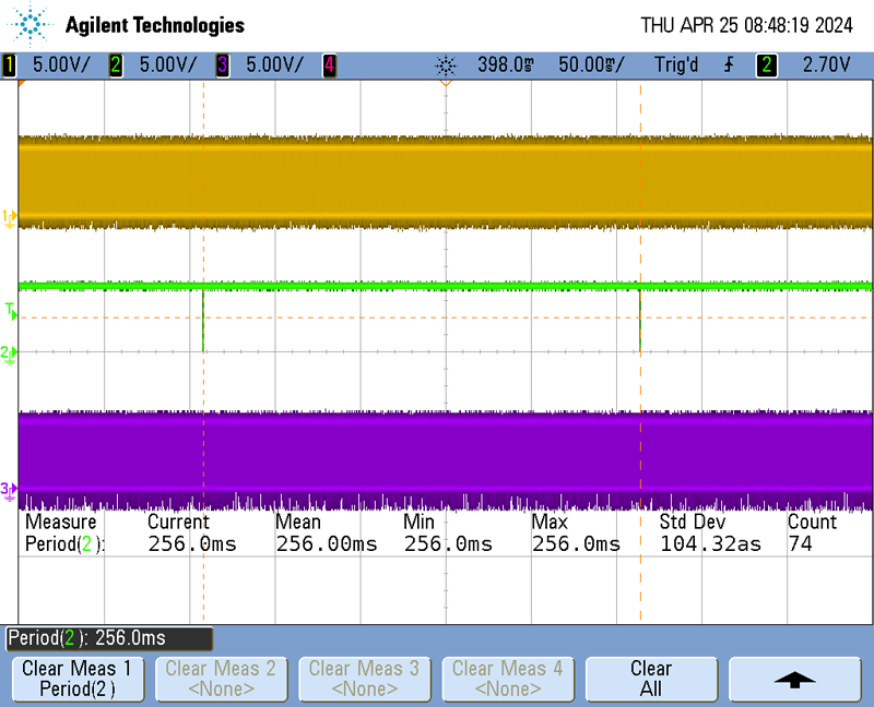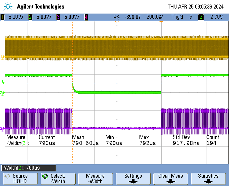TMS3707NC Five Decade Counter in FM Mode. Clock Input @ 320 kHz. Measurement Cycle = 256 ms (top), Gate Pulse = 0.8 ms (bottom). (CH 1: Clock Input, CH 2: Gate Output, CH 3: Pulse Input, CH 4: N.C.) ![]() ![]() |