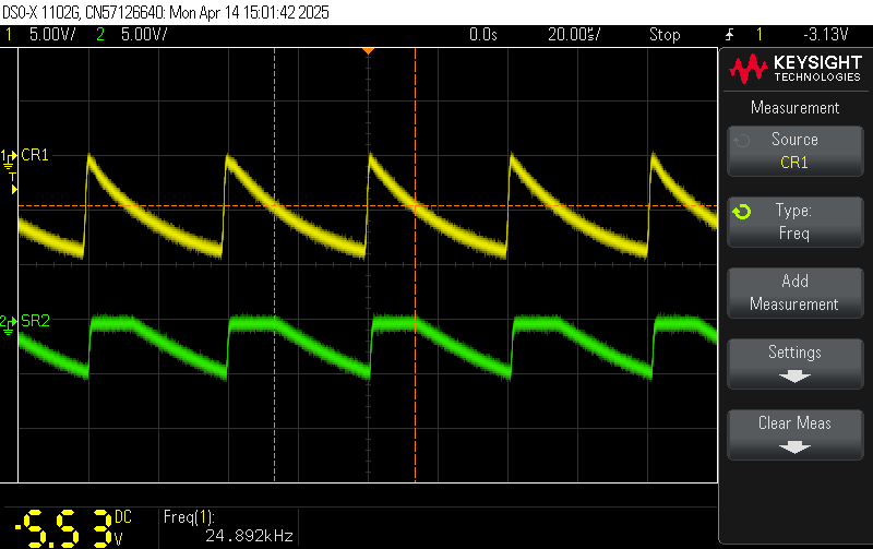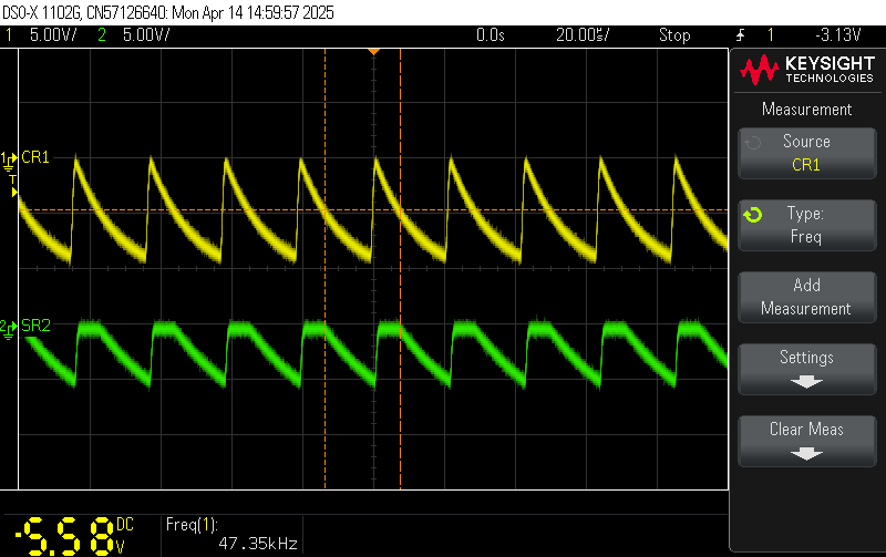 SR1 (bottom) pins of the µPD273C clock oscillator. DUT: µPD273C K3Y106 @ VDD = -6.0 V, VGG = -11.0 V, REXT1 = 100 kOhm, REXT2 = 200 kOhm, CEXT1,2 = 100 pF. ![]() |