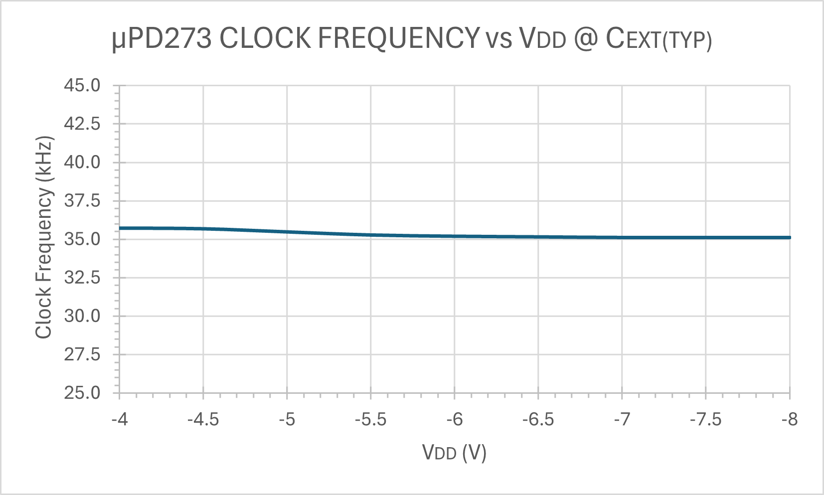 of a µPD273 Series single-chip calculator circuit. DUT: µPD273C K3X336 @ VGG = -11.0 V, REXT1 = 150 kOhm, REXT2 = 300 kOhm, CEXT1,2 = 100 pF. ![]() |