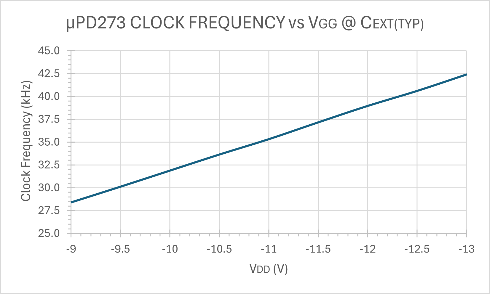 clock oscillator. DUT: µPD273C K3Y106 @ VDD = -6.0 V, VGG = -11.0 V, REXT1 = 150 kOhm, REXT2 = 300 kOhm, CEXT1,2 = 100 pF. ![]() |
