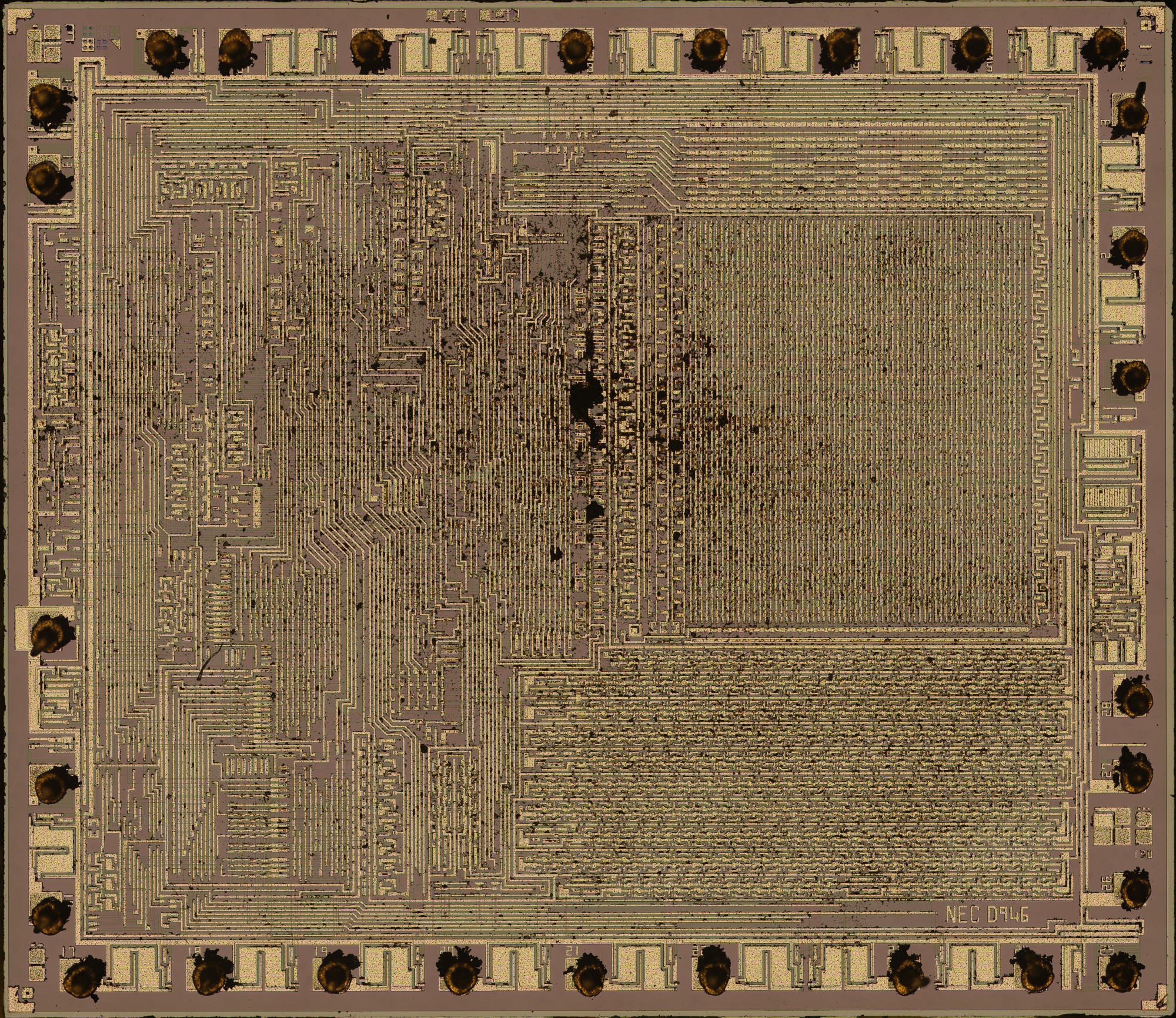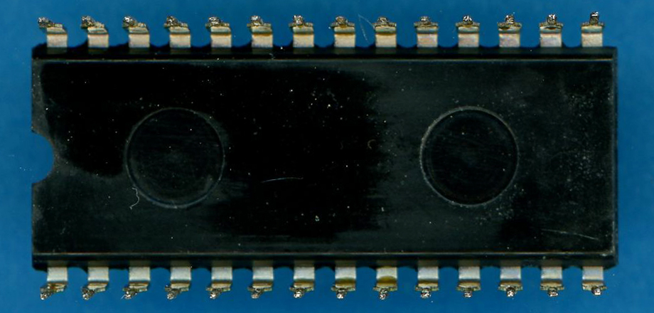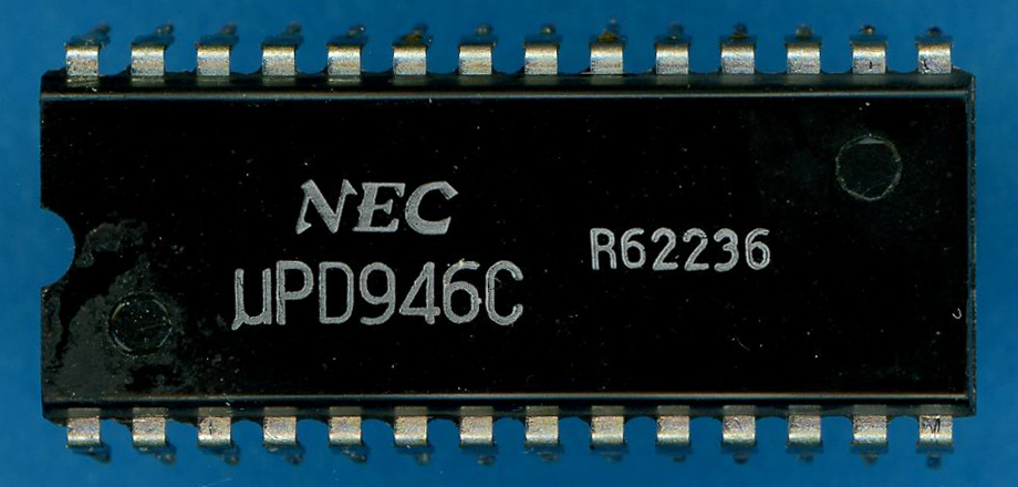 of the µPD946 single-chip calculator circuit used with the Royal RSC-40. PMOS Technology, 28-pin DIP 4-bit serial Register Processor, 512*17 Bits Instruction ROM, 5*52 Bits Data SAM. Manufactured March 1976. ![]() ![]() |