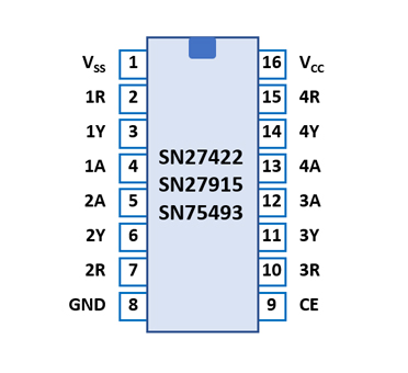 The SN75493 uses a standard 0.3” wide 16-pin DIP (Dual In-line Package with a 0.1” / 2.54 mm lead pitch).