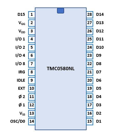 The TMC0580 uses for the clock oscillator an additional bond pad on its die located between the VSS and D0 pins. Three different configurations are possible with the additional bond pad, depending on the target application: