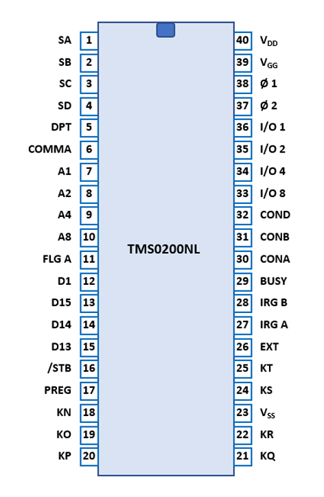 4 S-Times Outputs SA, SB, SC, and SD to signal the 16 States of the Instruction Cycle and synchronize Digit Scanning between the TMS0300 ROM Chip (11 digits D2 D12) and TMS0200 Data Chip (4 digits D1, D13 D15) IRG A and IRG B Inputs to receive the 13-bit Instruction Words from the TMS0300 ROM in two chunks of 6 bits (IRG A B0 B5) and 7 bits (IRG B B6 B12) 4-bit bidirectional I/O Bus I/O 8, I/O 4, I/O 2, and I/O 1 to communicate with the never introduced 10-Register Chips, the two 16-digit Registers of the TMC0400 ROM/Register Chips or the TMS0220 Printer Chip. Note: The ROM section of the TMC0400 is fed through its 13-bit parallel connection with the TMS0300 to the TMS0200 CONA Output: Inhibit Increment ROM (Interrupt sequence) CONB Output: Idle Condition of Data Chip (Idle = Display Mode) COND Output: Condition Flag FLG A Output to transmit the Flag register serially PREG Output: P Register Data Chip addresses ROM /STB Output as a programmable signal based of D-Times (Display Times, scanning digits) BUSY Input for slow devices like the Printer Chip |