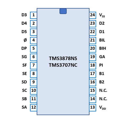 The TMS3878NS and TMS3707NC are using a standard 0.6 wide 24-pin DIP (Dual In-line Package with a 0.1 / 2.54 mm lead pitch).