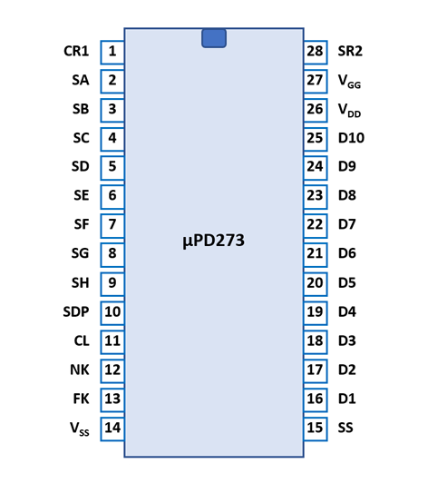 The µPD273 uses a standard 0.6” wide 28-pin DIP (Dual In-line Package with a 0.1” / 2.54 mm lead pitch).