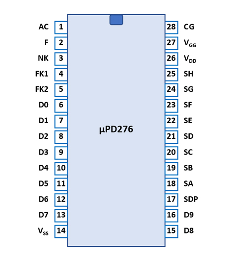 The µPD276 uses a standard 0.6” wide 28-pin DIP (Dual In-line Package with a 0.1” / 2.54 mm lead pitch).