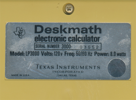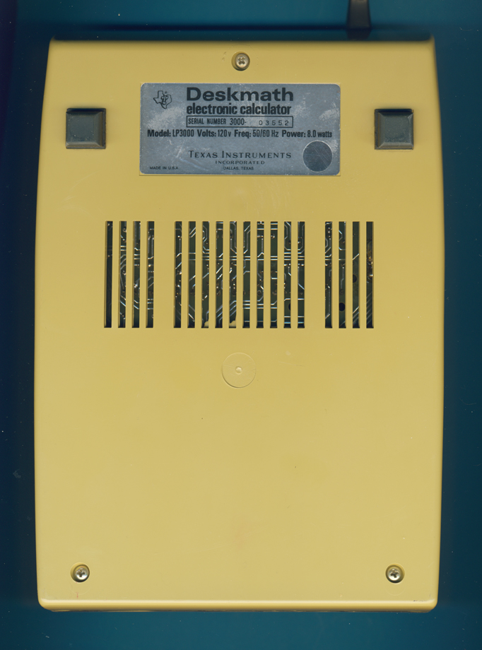 of the TI-3000 Deskmath sports the TI logo and the TI-3000 designation in a black printing. |