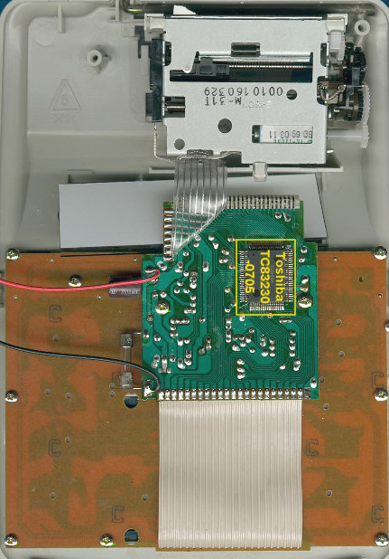 circuit board (PCB) of the TI-5032SVC with a Toshiba TC83230-0705 single-chip calculator circuit.