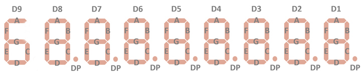 | The Anode of the Segments A-G and Right-Hand Decimals and the Cathode of the Digits 1-9 are connected to the display in the pictured way. |