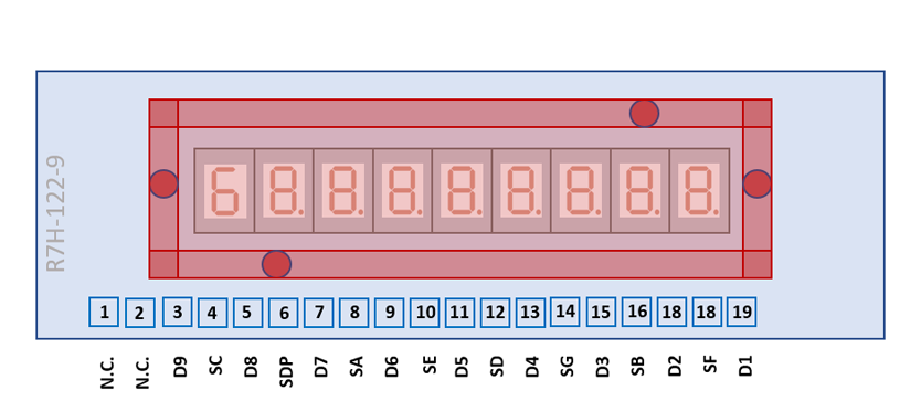 The R7H-122-9 uses a 2.40" / 60.8 mm by 0.72” / 18.3 mm rectangular printed circuit board (PCB) with 19 solder tabs with a 0.1” / 2.54 mm pitch arranged on the bottom of the display module.