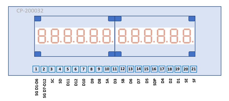 The CP-200032 uses a 2.65" / 67.5 mm by 0.87” / 22.0 mm rectangular printed circuit board (PCB) with 21 solder tabs with a 0.1” / 2.54 mm pitch arranged on the bottom of the display module.