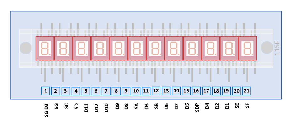 The DIS115 Twelve-Digit display assembly consists of a printed circuit board (PCB) with 12 individual DISXXX Seven-Segment displays and succeeds the CP-200032 Display-PCB introduced with the SR-10 Version 1 and based on the TIL360 Multi-Digit displays. While the DIS115 maintains the mechanical dimensions of the CP-200032, improves its increased spacing between the DISXXX elements and the integrated magnifying lens the readability of the 0.115”/2.92 mm characters significantly.