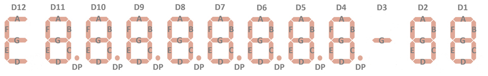 The Anode of the Segments A-G, Segment G (H) for minus sign of the Exponent and Right-Hand Decimals and the Cathode of the Digits 1-12 are connected to the display in the pictured way. |
