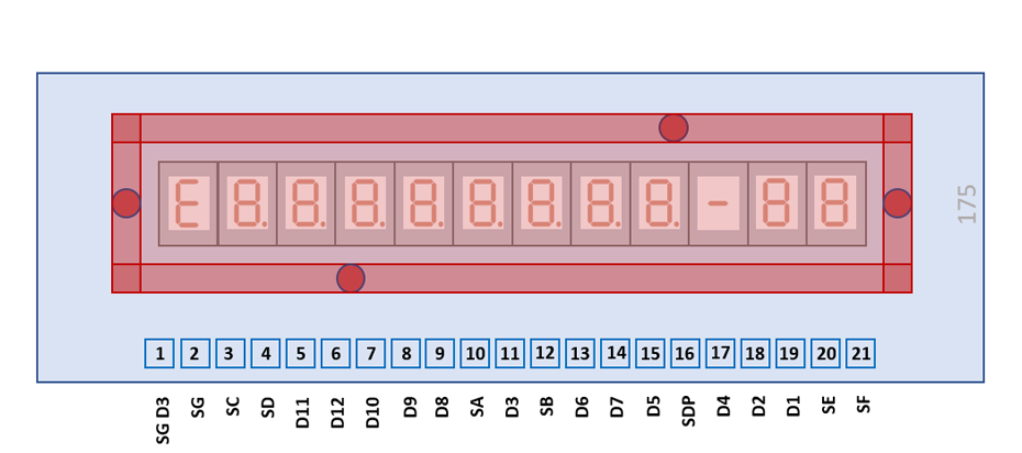 The DIS175 Twelve-Digit display assembly consists of a printed circuit board (PCB) with 12 individual, partly populated Seven-Segment displays and succeeds the DIS115F Display-PCB introduced with the SR-10 and using 12 individual DISXXX Seven-Segment displays. While the DIS175 maintains the mechanical dimensions of the DIS115F, reduces its decreased spacing between the individual display elements and the missing magnifying lens the readability of the 0.125”/3.2 mm characters slightly.