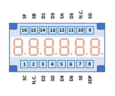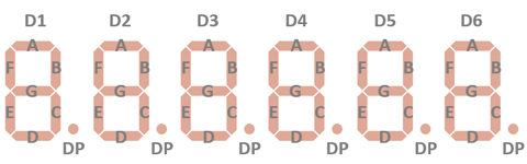 The Anode of the Segments A-G and DP (Decimal Point) and the Cathode of the Digits 1-6 are connected to the display in the pictured way. |