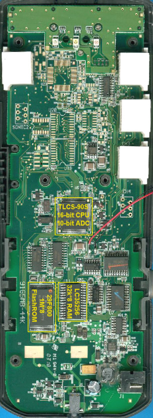 holds a Toshiba TMP91CW12F microcontroller with fast 10-bit AD-converters, a 32k Bytes RAM and 1M Byte of Flash memory. |