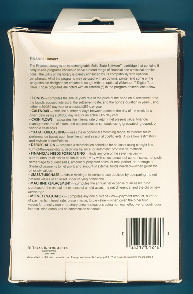 FINANCE Solid State Software Cartridge (SSSC) sold around 1983 in the US.