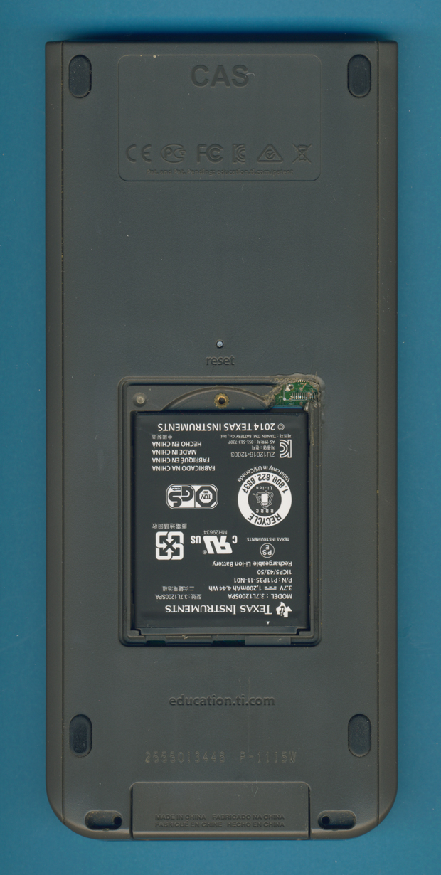 of the TI-Nspire CX CAS features a cover to access the rechargeable battery.