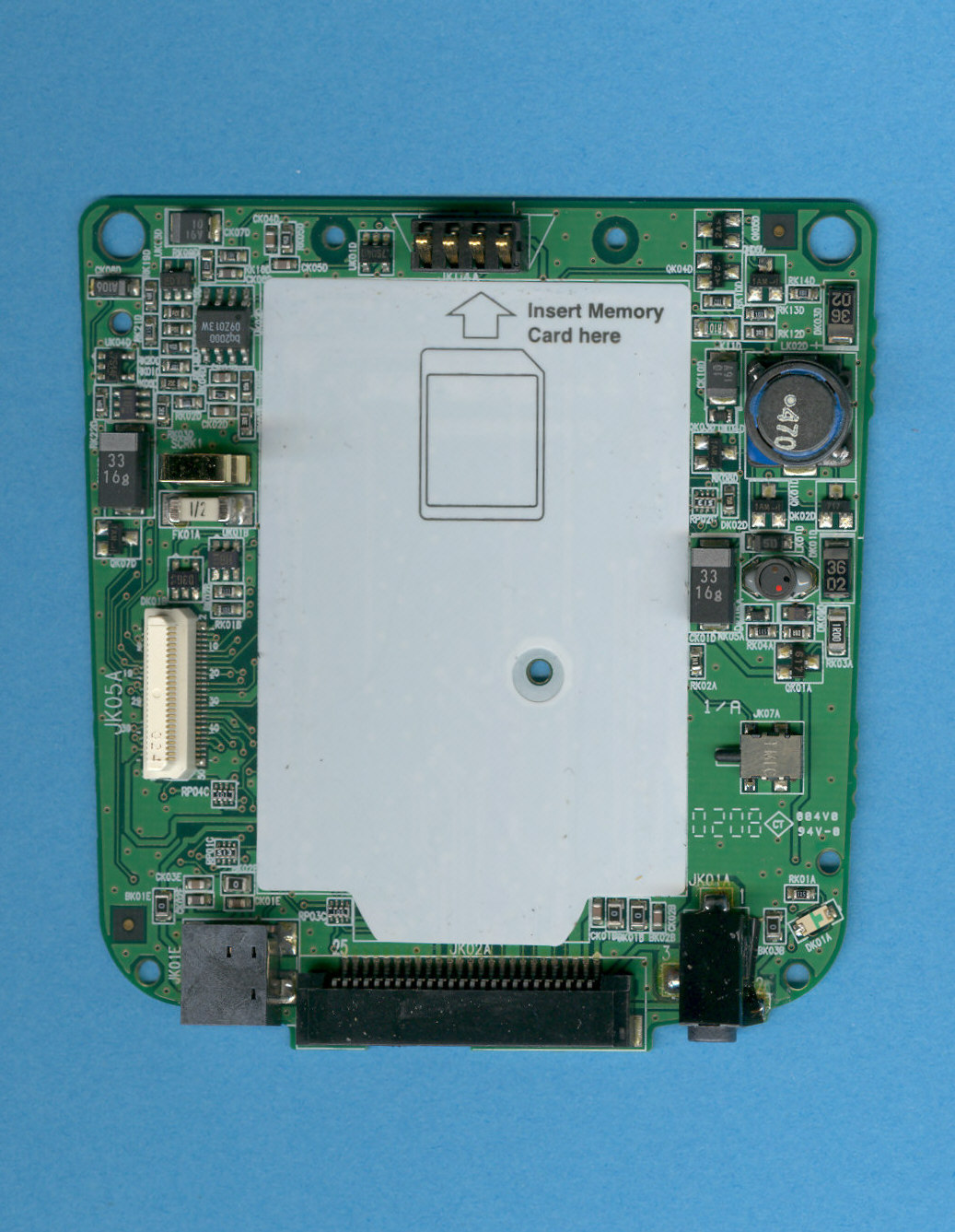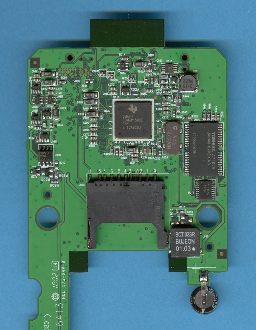 Instruments OMAP™ family. It is supported by a Toshiba TC58V64A 8M * 8bits CMOS NAND EEPROM and some power supply components. The huge connector below the OMAP™ matches with a standard SD Memory Card. |