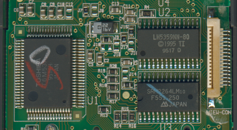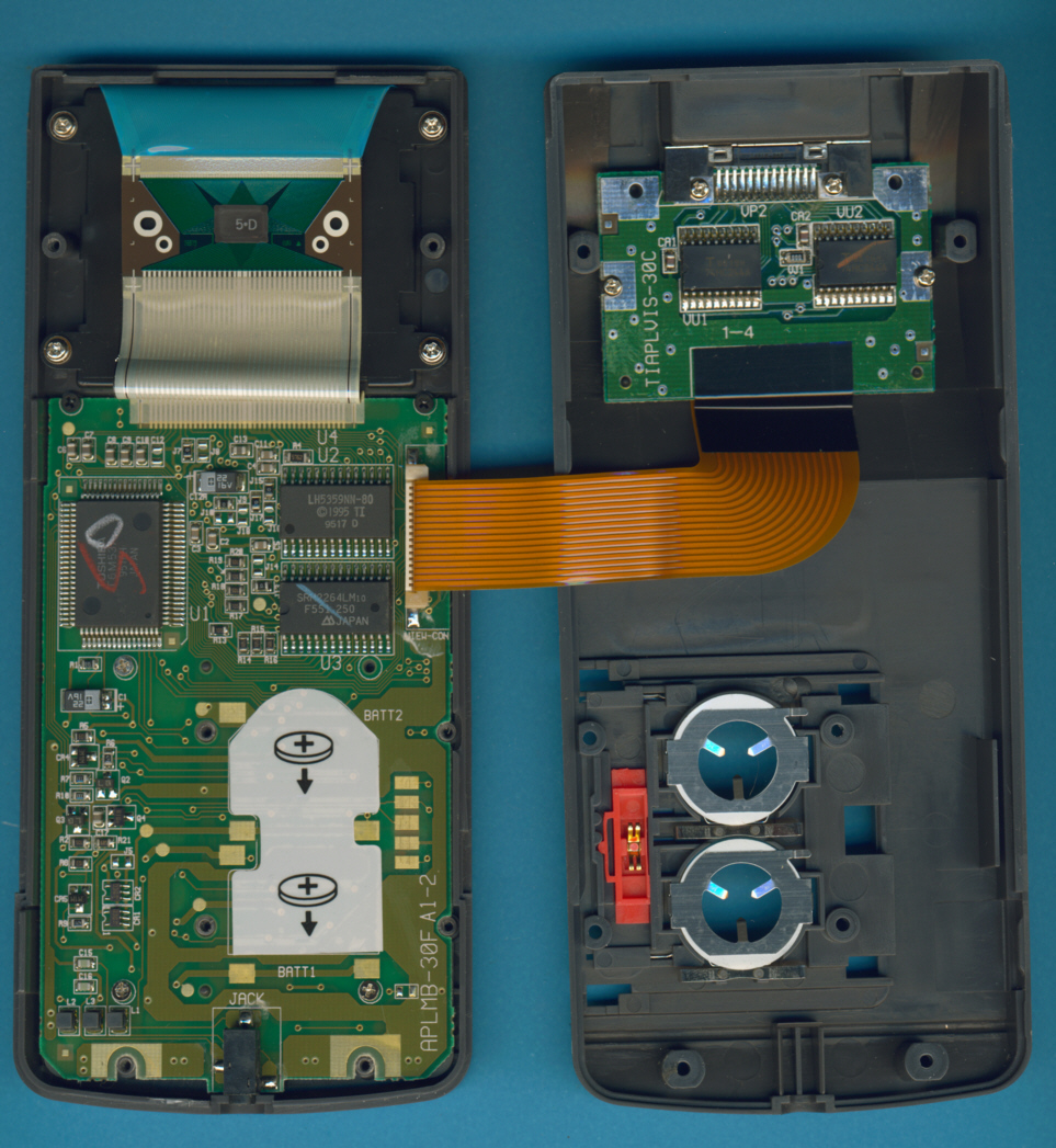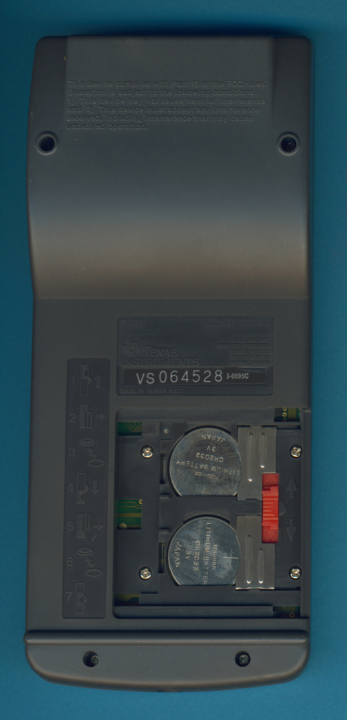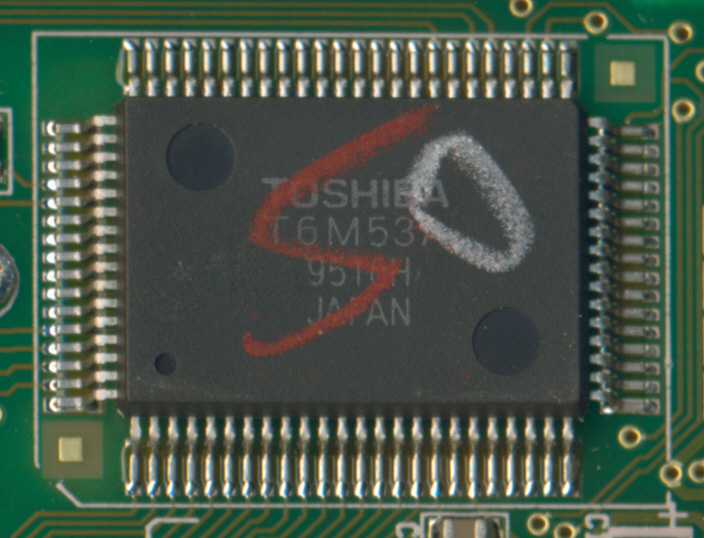 components of the TI-80 VSC: Toshiba T6M53A Application Specific CPU, Sharp LH5359@1995 ROM and Suwa Seikosha SRM2264 RAM.