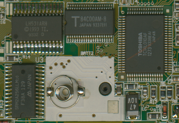 components of the TI-82: Toshiba T84C00 CPU, Toshiba TC14L010 ASIC, Sharp LH531©1993 ROM and Suwa Seikosha SRM2A256 RAM. |