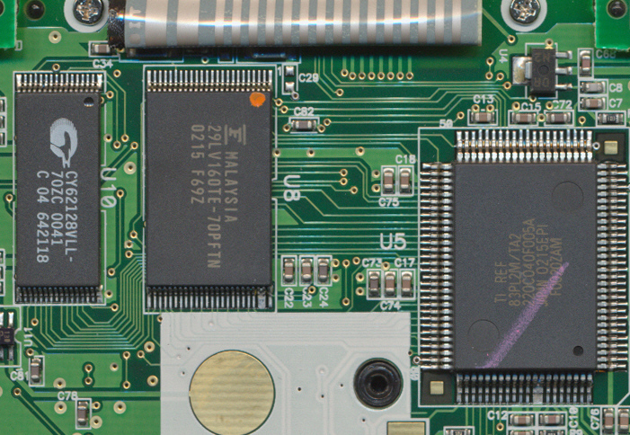 Plus S.E. VSC manufactured in August 2002 utilizes two huge memories: The S-RAM Cypress CY62128 stores 128k Byte Data and the Flash-ROM Fujitsu 29LV160 holds up to 2M Byte Program. |