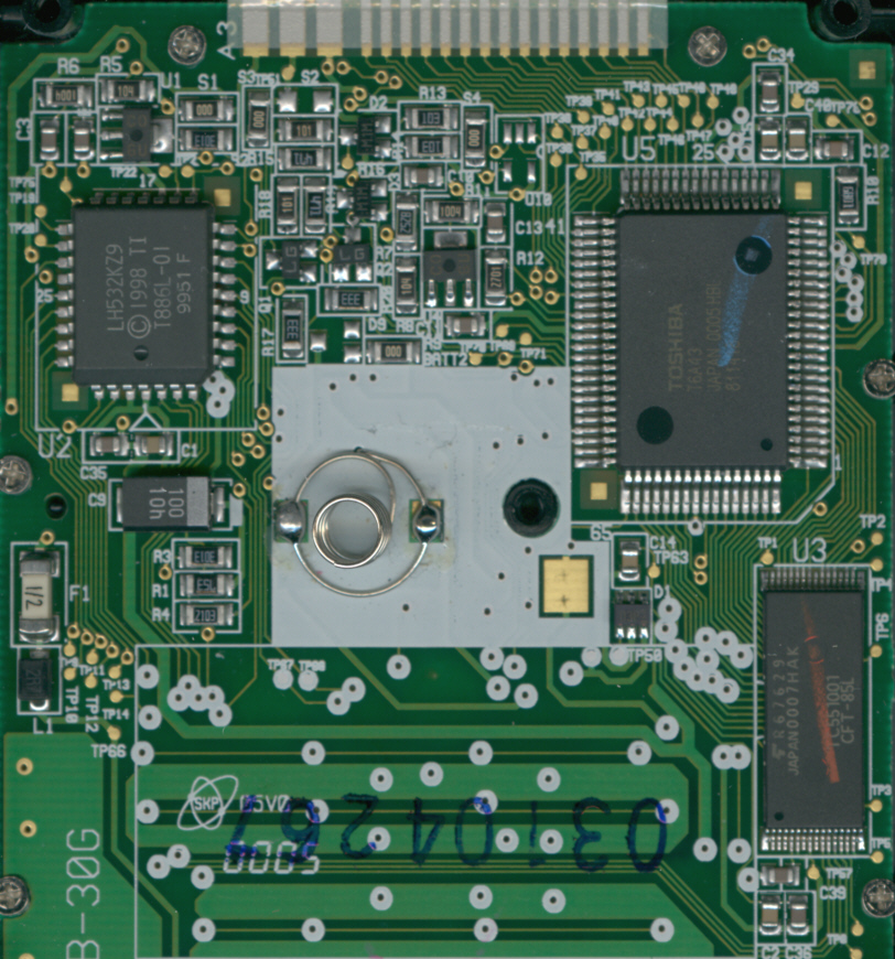 components of the TI-86: Toshiba T6A43 Application Specific CPU, Sharp LH532 ©1998 ROM and Toshiba TC551001 RAM. |