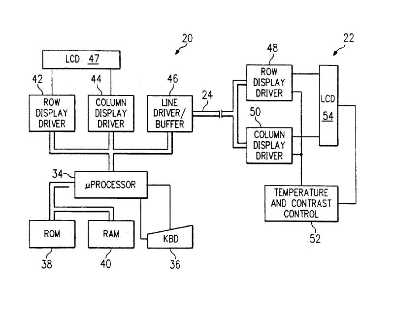 The line driver/buffer drives the cable 24. The cable 24 is also connected to row and column display drivers 48 and 50 of the remote display 22. The row and column display drivers 48 and 50 are coupled to a temperature and contrast control circuit 52. An LCD (or other suitable display) 54 is connected to the row and column display drivers 48 and to the temperature and contrast control circuit 52.