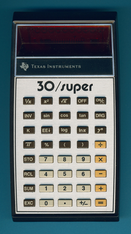 TI-30 introduced in 1976 • The double-shot injection molded keys are known from the Business Analyst-I • The printed Texas Instruments logo between the display and keyboard are carried over from the European TI-45 |