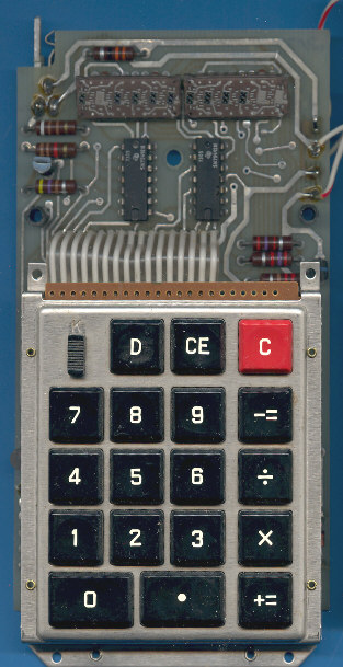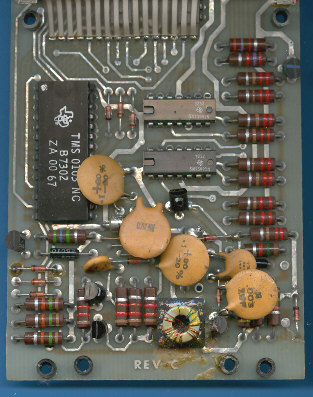 circuit board (PCB) of the Montgomery Ward TXI-8642A makes use of a TMS0103 or TMS0109 single-chip calculator circuit.