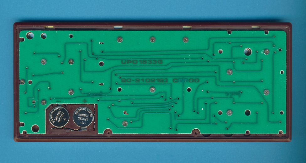 (PCB) of the Aurora CB-900 Check Book Calculator is centered around a NEC uPD1833G single-chip calculator circuit.