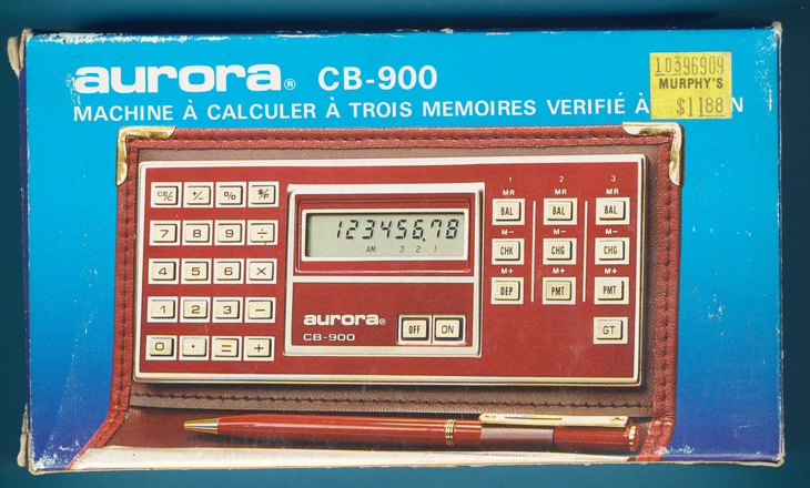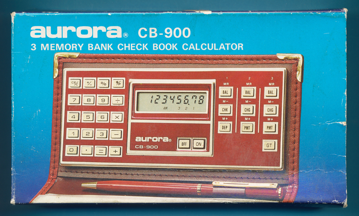 box of the Aurora CB-900 Check Book Calculator sold around 1983
