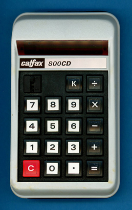 the featured calfax 800CD calculator manufactured in October 1973 in Hong Kong