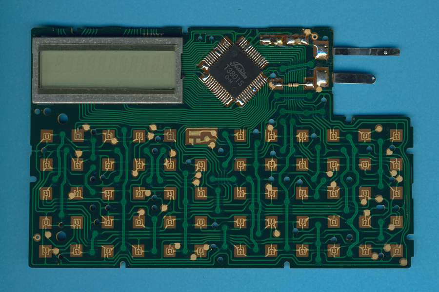 (PCB) of the Canon Canon card F-63 is centered around the Toshiba T3801S single-chip calculator circuit. |